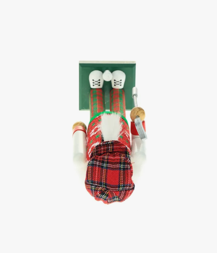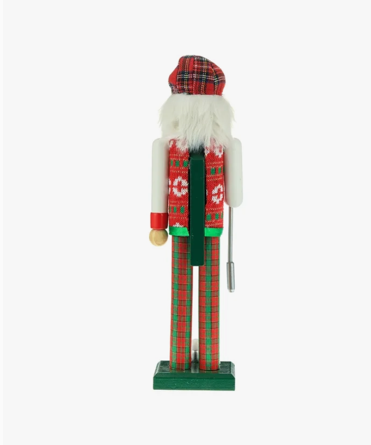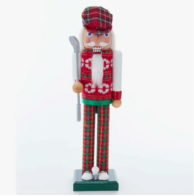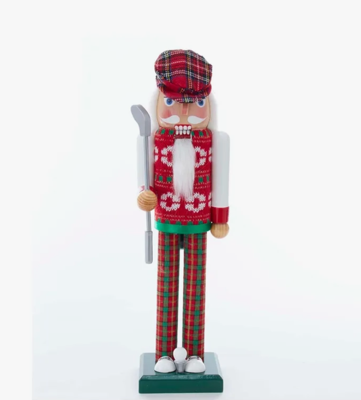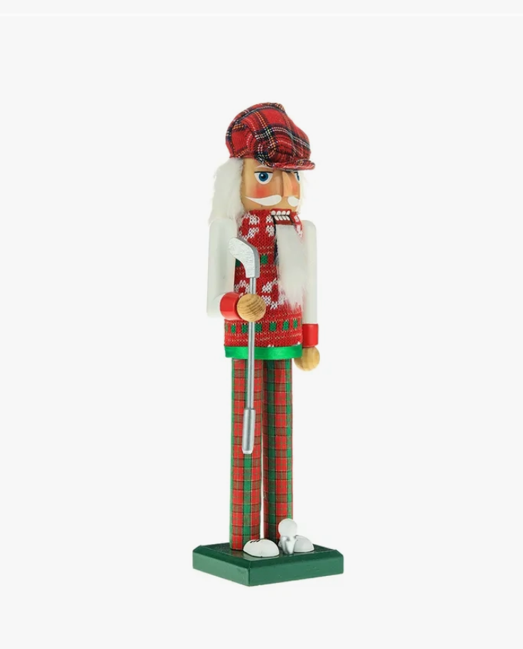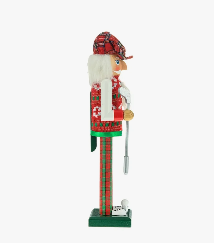 This 15 wooden golfer nutcracker from Kurt Adler is a beautiful addition to your holiday décor or collection. This nutcracker features red and green plaid pants with matching hat and a red, white and green sweater. He is holding a golf club and stands on a green base with tee and golf ball.