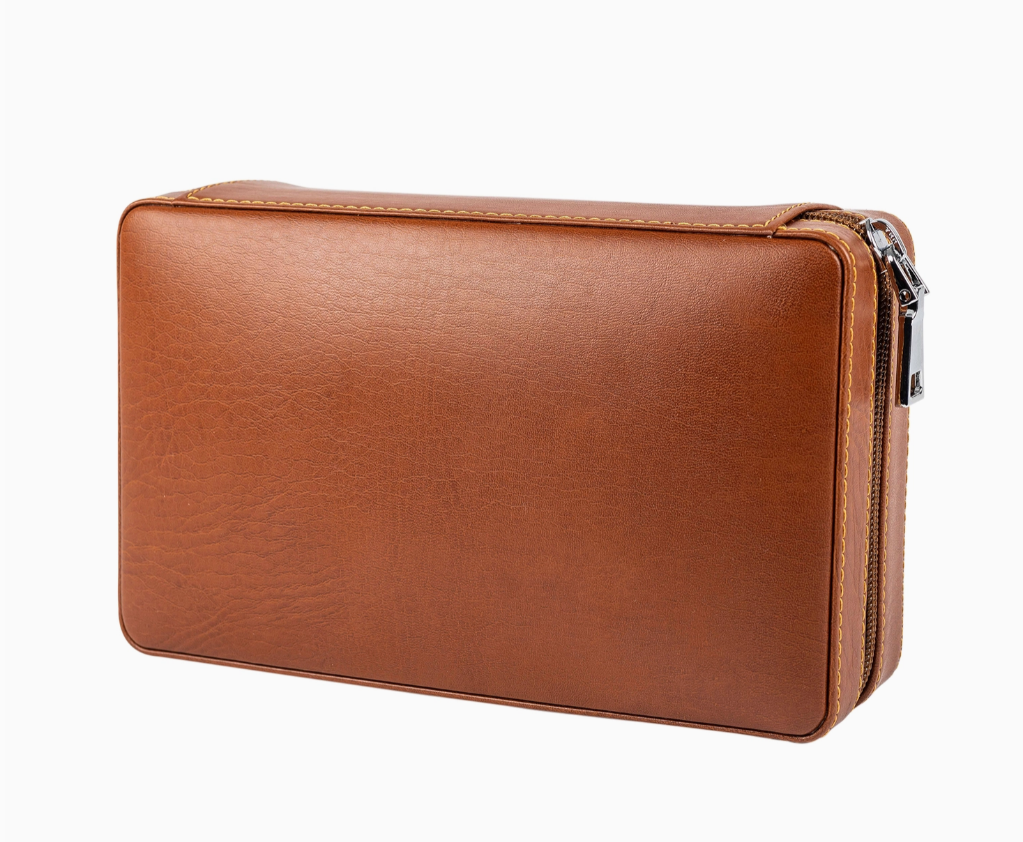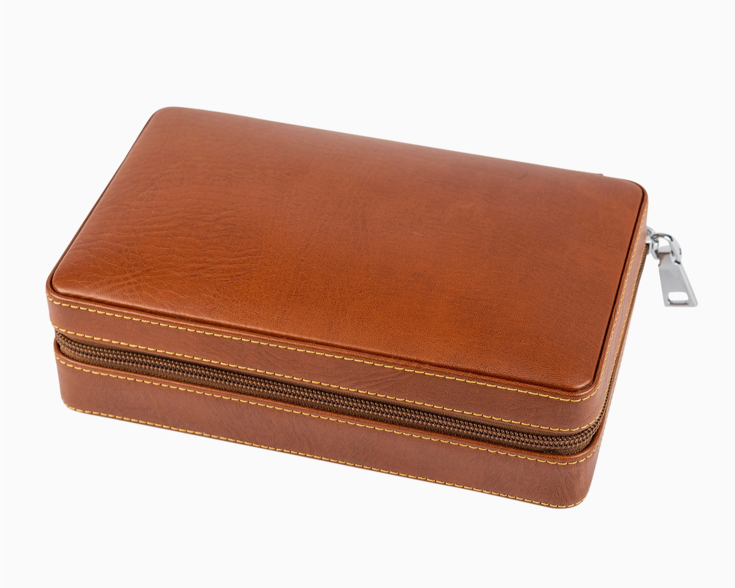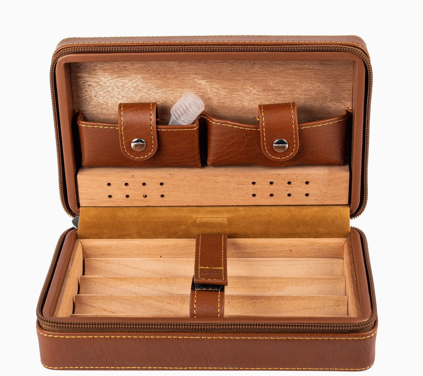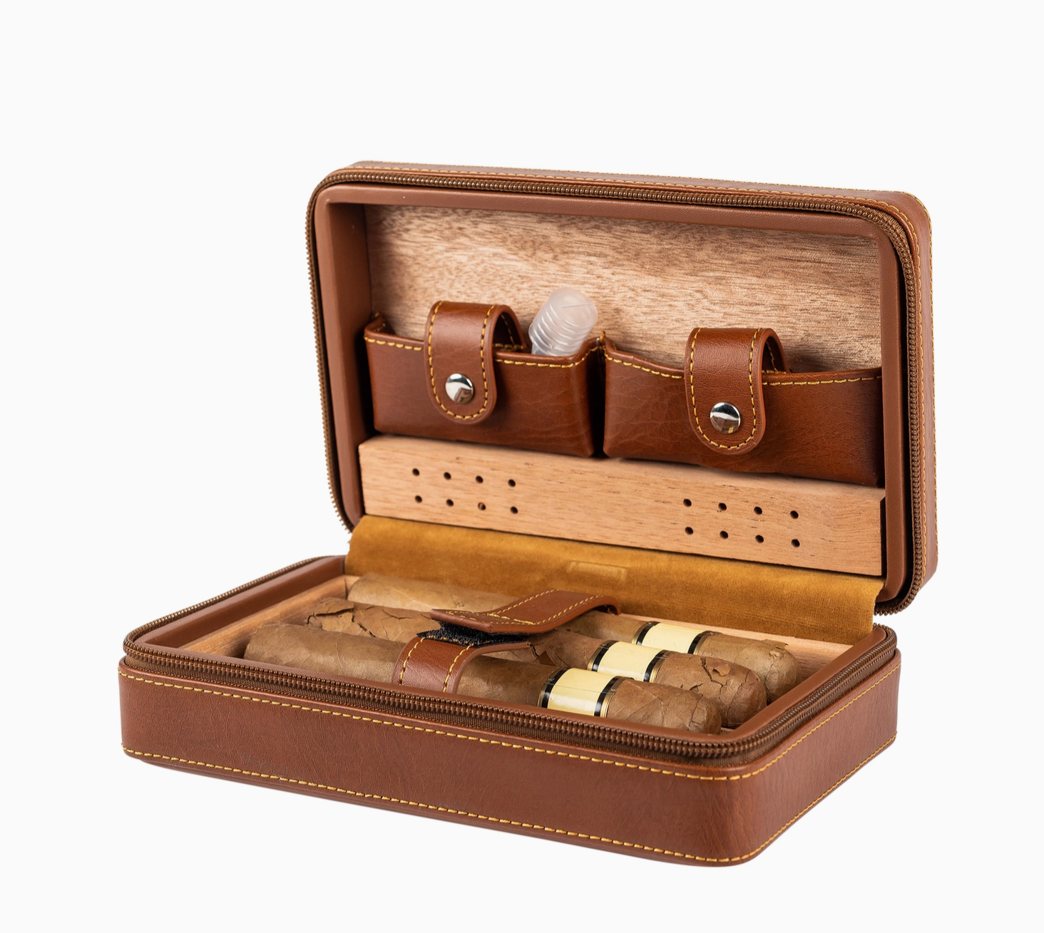 The perfect way to keep your cigars fresh. The Executive Humidor includes a cigar cutter and cedar wood tray with a leather strap to secure and protect up to four cigars. Easy to use: All you need to do is to add distilled water or humidor solution to the humidifier and place in the case to keep your cigars from drying out. Dimensions: 8 x 2.5 x 5