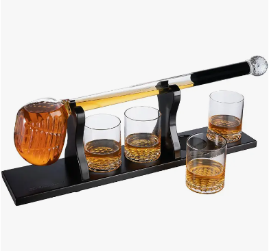 * GOLF CLUB SHAPED DECANTER - The unique liquor decanter design is handblown in the shape of a golf club. Made from premium borosilicate glass which is hypoallergenic, BPA free, and 100% lead-free. A finely crafted mahogany wood base serves as the ideal caddy.