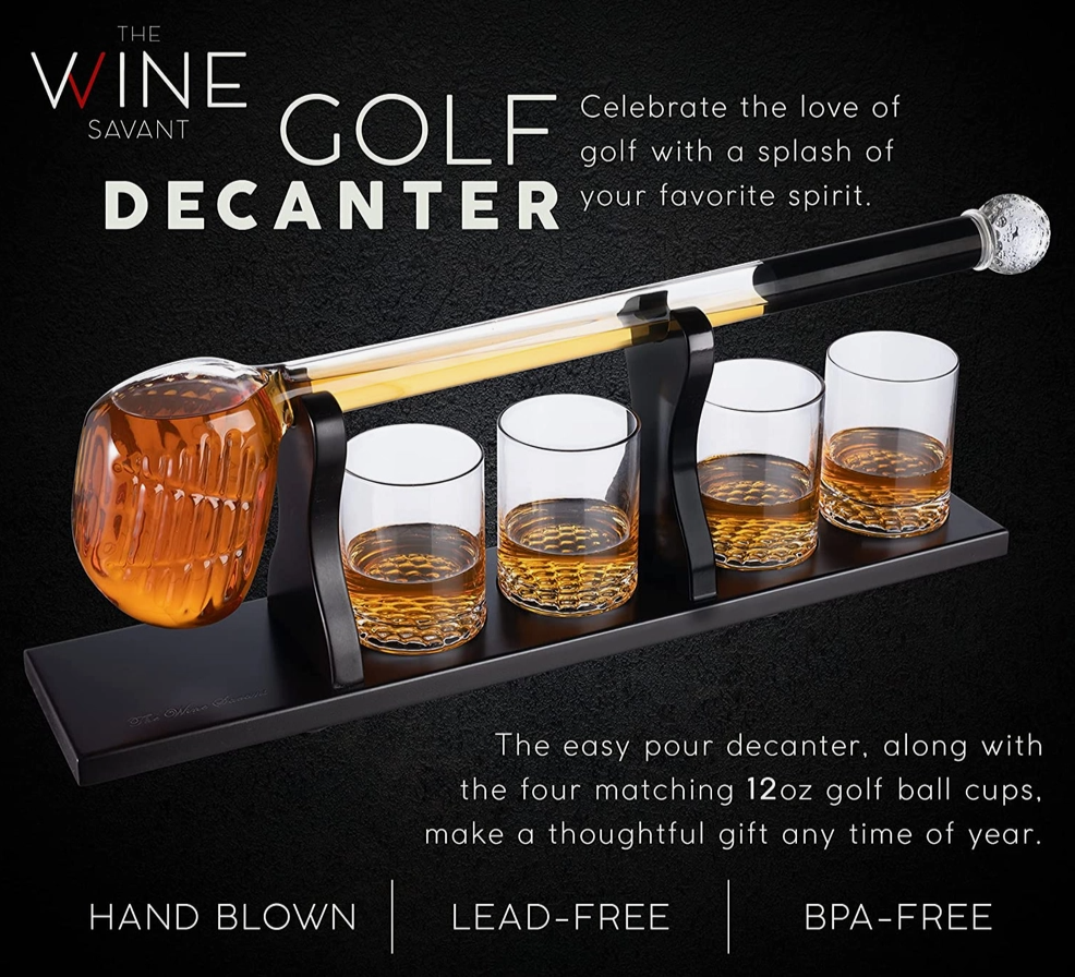 * GOLF WHISKEY DECANTER SET - Store spirits with sophisticated style as you celebrate the love of golf. Golf whiskey decanter sets include one glass decanter, four liquor glasses, and a mahogany wood base for impressive display that is both elegant and functional.