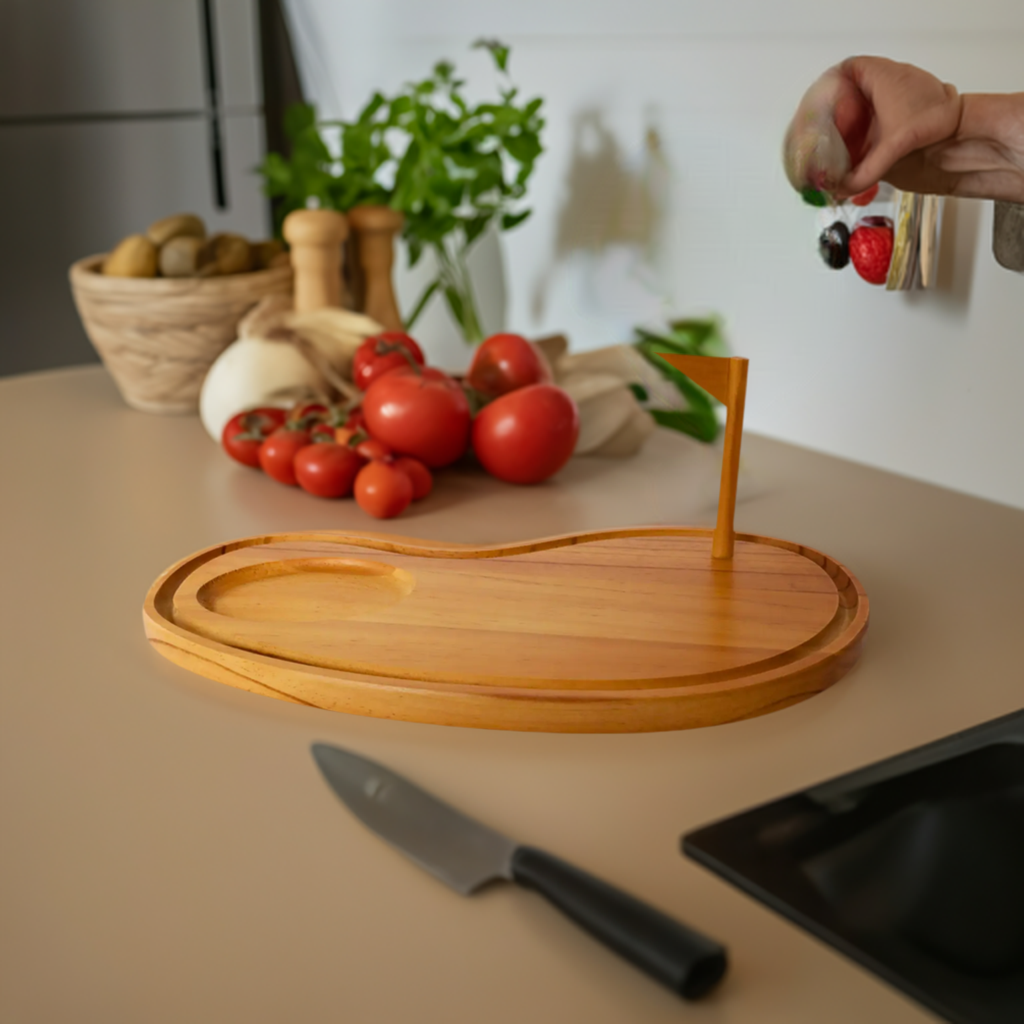 Crafted with precision and attention to detail, this unique cheese board is shaped like a mini golf course, adding a playful touch to your dining or entertaining experience. The board is made from high-quality wood, ensuring durability and a distinctive aesthetic that stands out on any table.