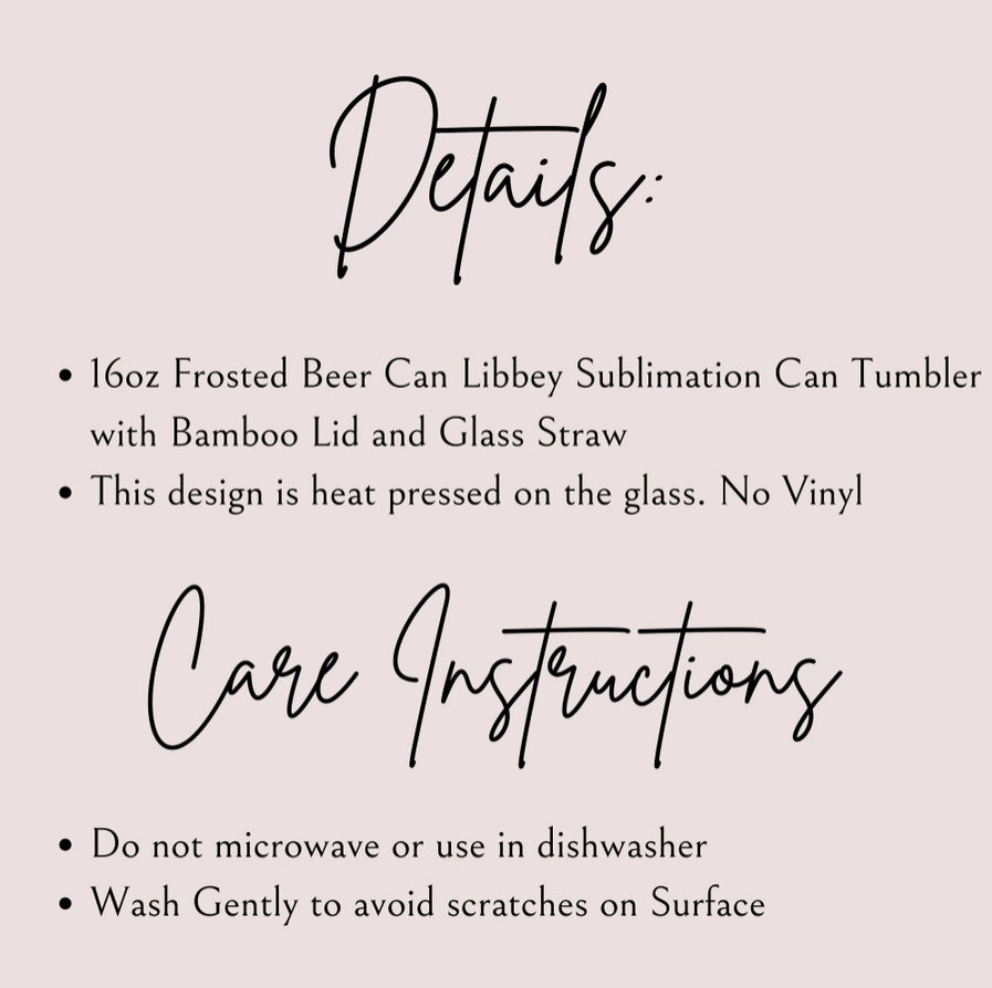Introducing our Handmade Frosted Iced Coffee Glass with Lid and Straw, the perfect Beer Glass and Camping Gift for anyone! Made with high-quality 16 oz Frosted Glass using heat-pressed Sublimation designs, these Camping Glasses are a must-have for any Camping Life enthusiast. The unique design, with a Bamboo Lid and Clear Straw, makes this Camping Accessory perfect for everything from a leisurely golf cart ride to a Roadie trip with friends. Highlights: - Handmade design ensures each Camping Glass is unique and special - Frosted Glass Cup for a unique and stylish look - Perfect size at 16 oz for all your beverage needs - Bamboo Lid and Clear Straw ensures your drink stays secure - Ideal for camping, golf carts, or any other recreational activity